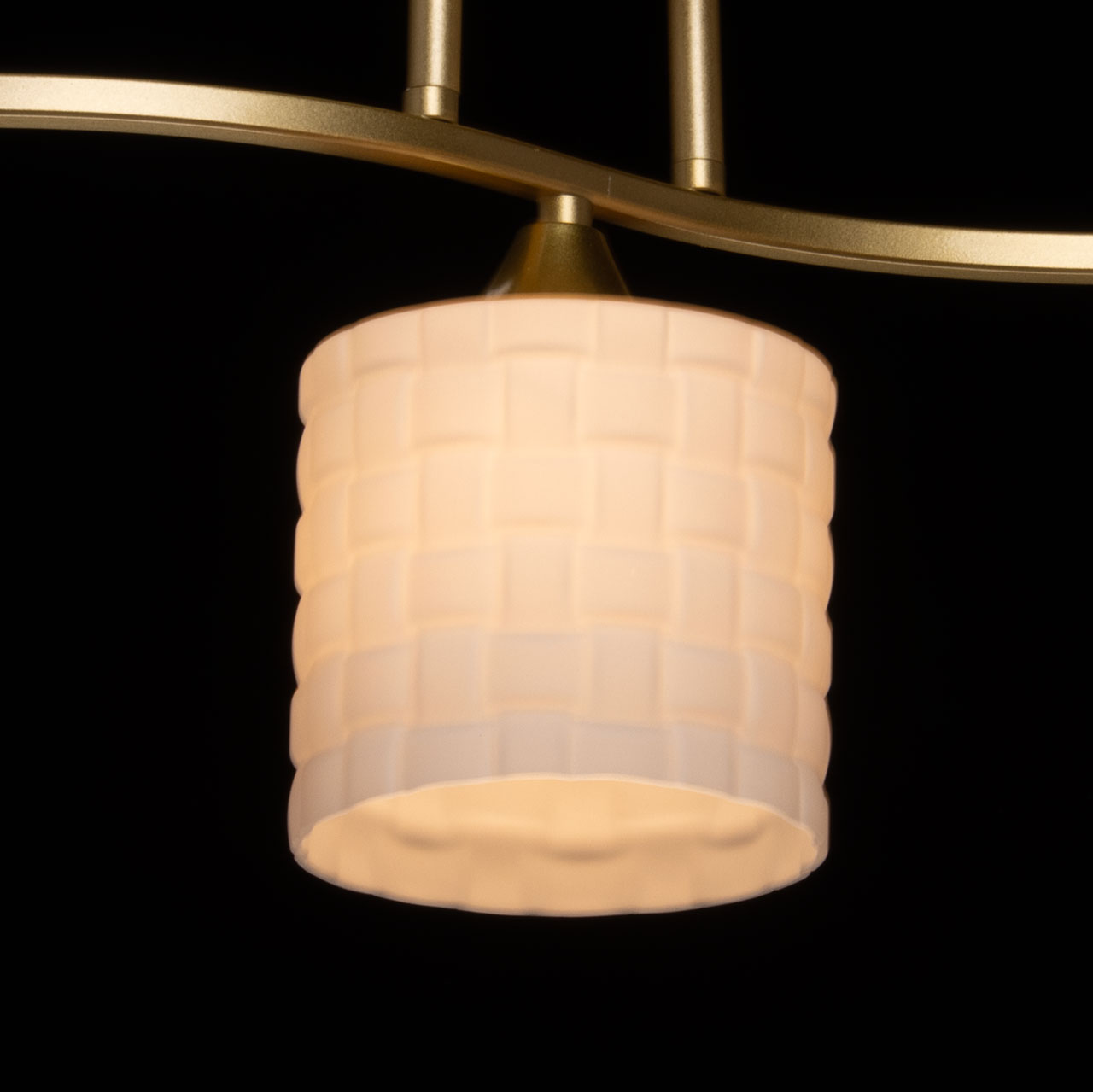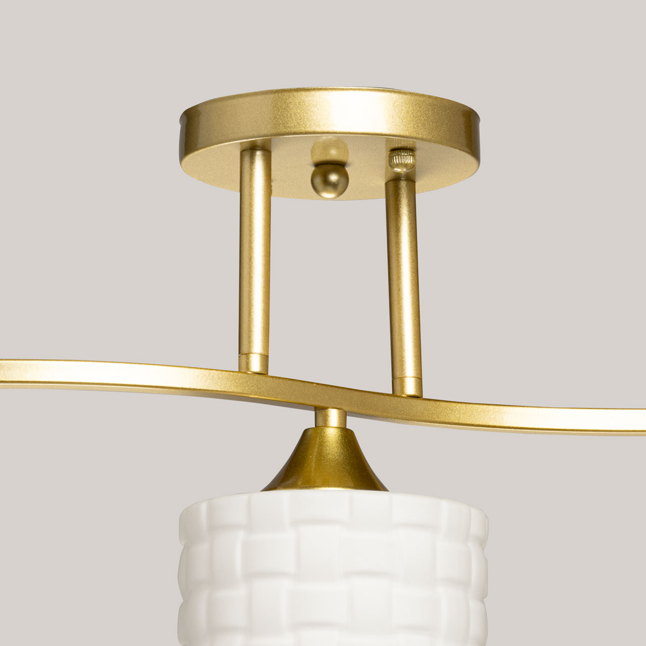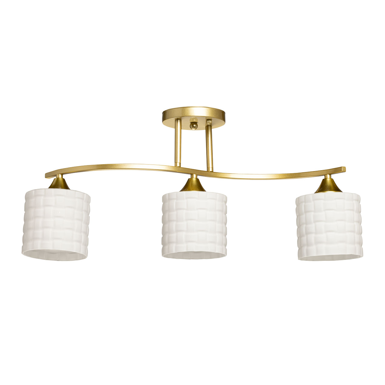 Металлическое основание потолочной люстры окрашено в цвет золота. Стеклянные плафоны отлиты в сложную форму и окрашены в белый цвет.