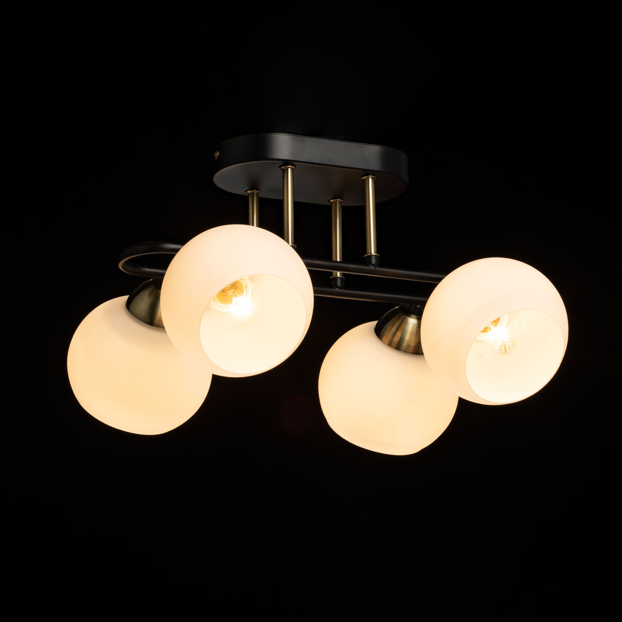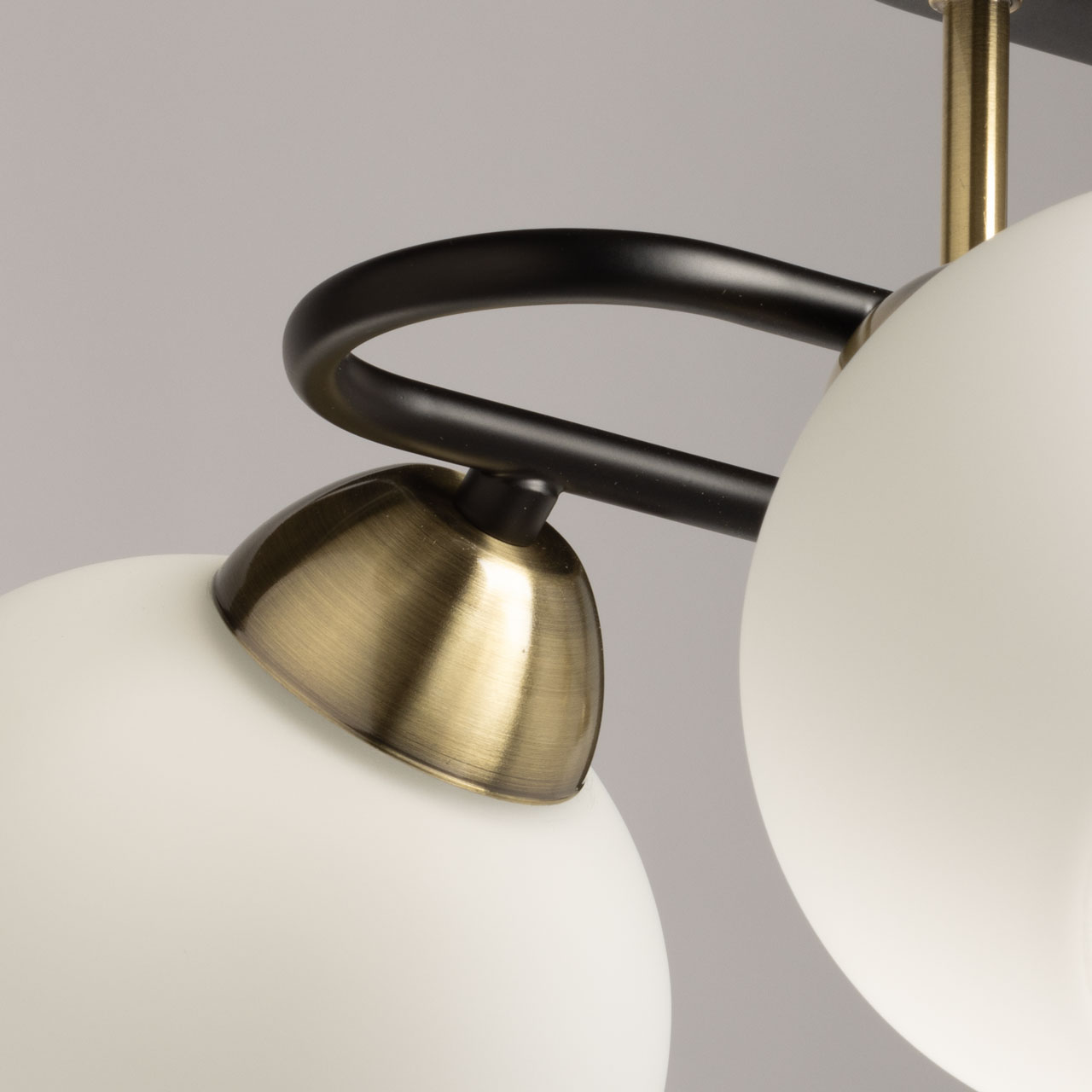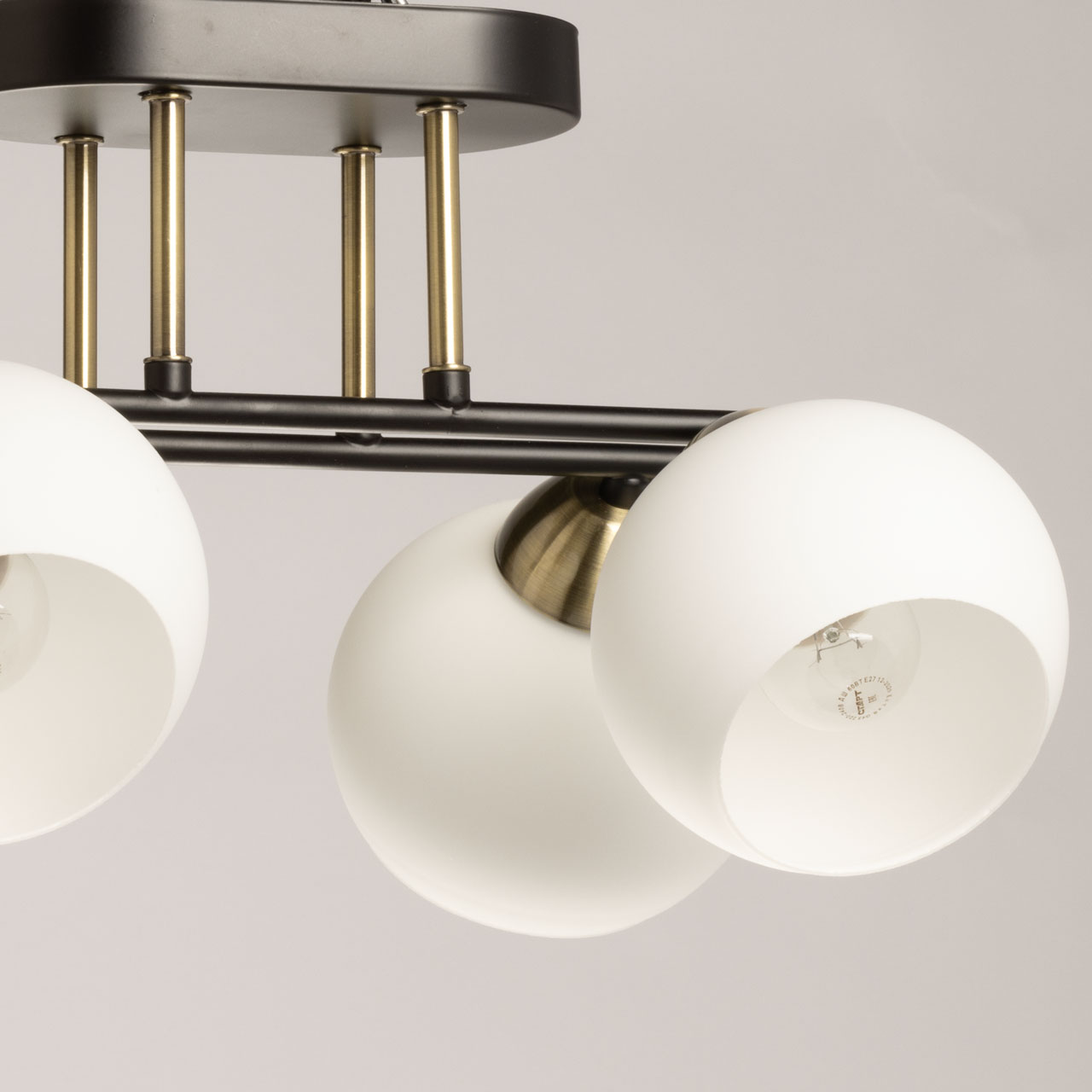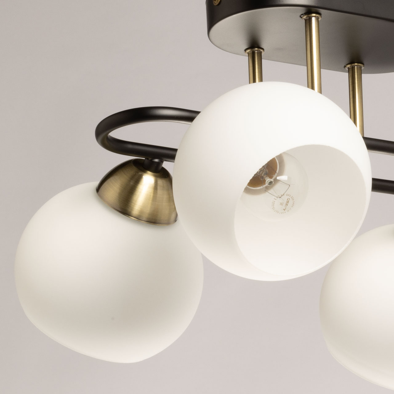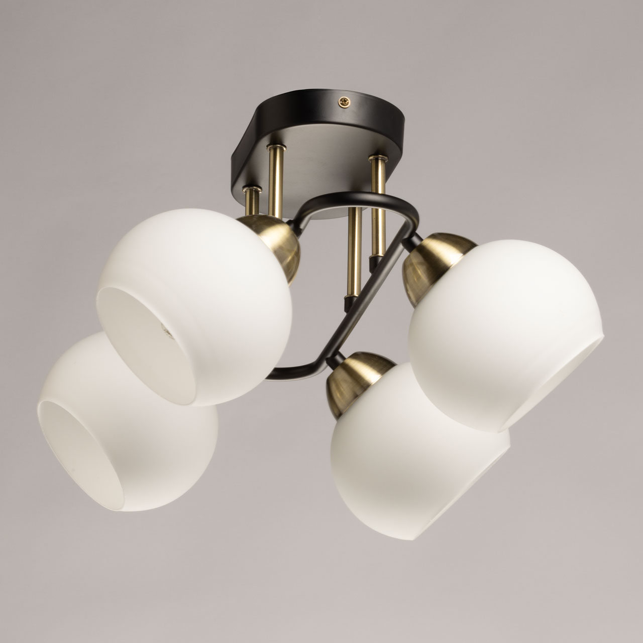 Металлическое основание потолочной люстры окрашено в черный цвет. Отдельные элементы гальванизированы в цвет античной бронзы. Светильник декорирован стеклянными плафонами белого матового цвета.
