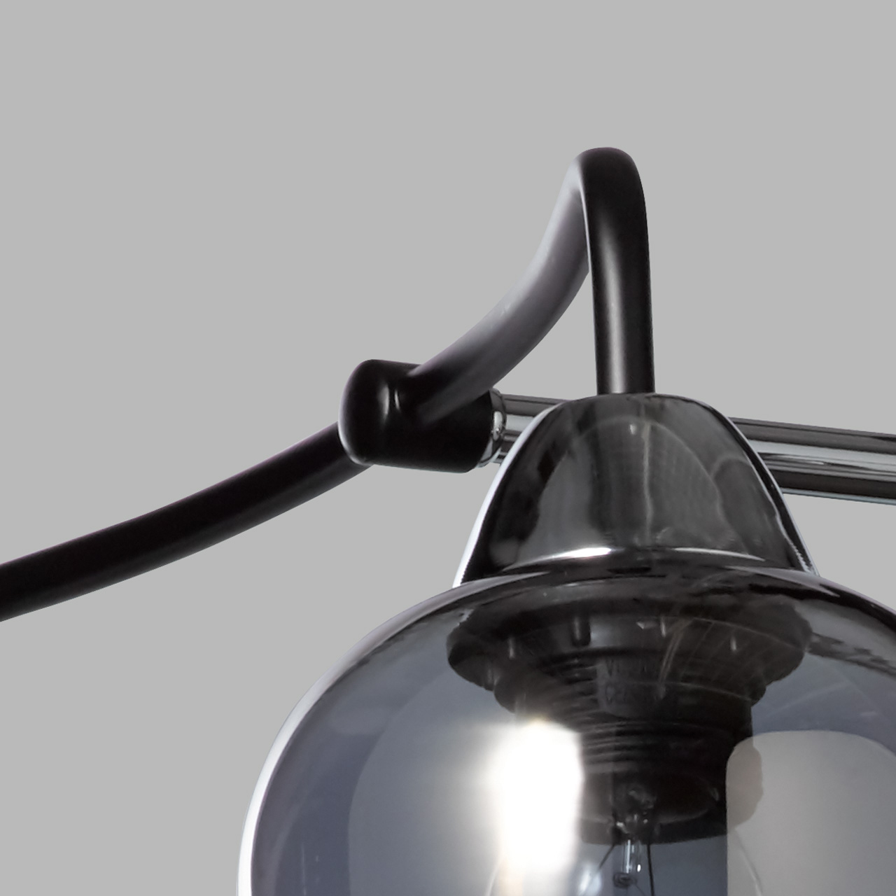 Основание светильника выполнено из металла и гальванизировано в цвет хрома. Отдельные элементы основания окрашены в черный цвет. Стеклянные плафоны отлиты в форму и гальванизированы в дымчатый цвет. У основания, плафоны окрашены в черный цвет. Края плафонов оплавлены.