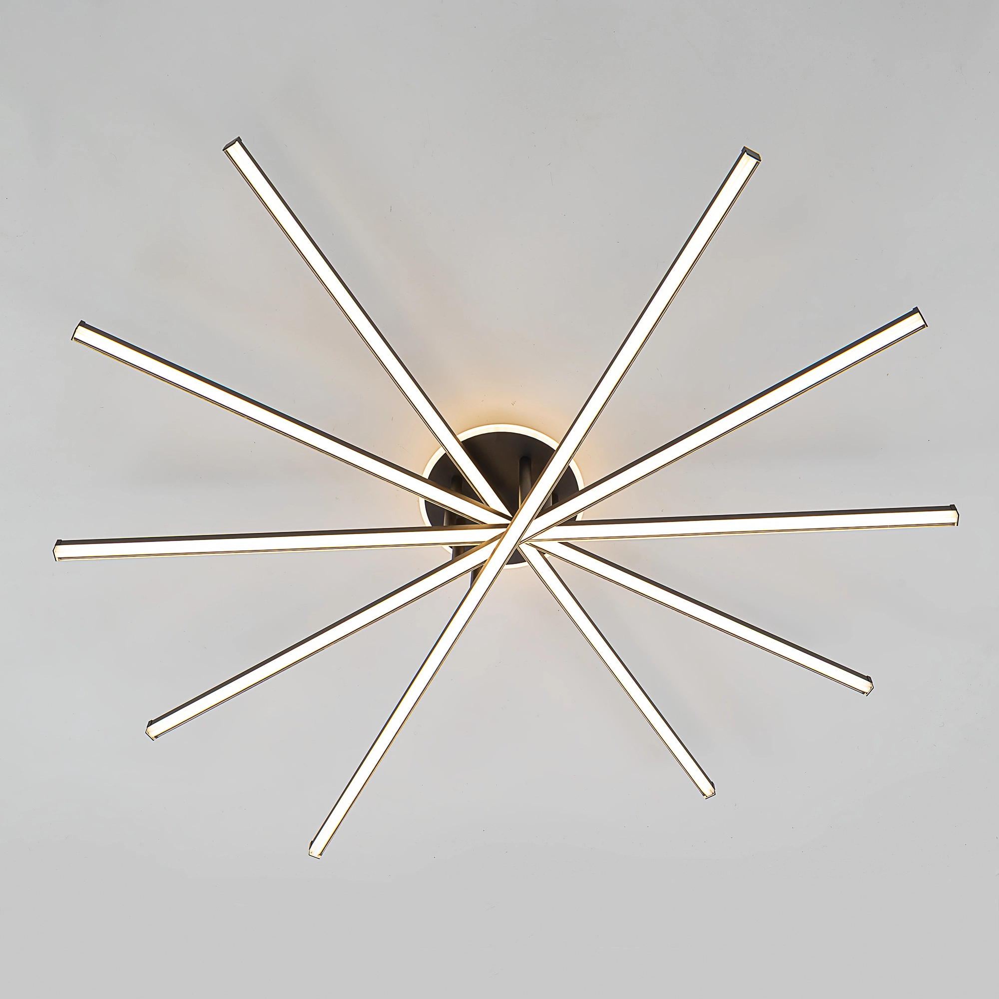 Корпус люстры — из металлического сплава, окрашенного черной краской. Глянцевый рассеиватель — из специализированного оптического полимера. У люстры есть изящная подсветка потолка.