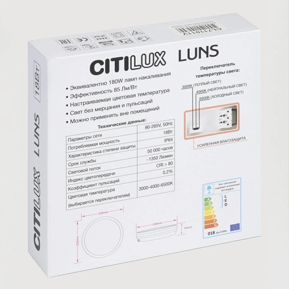 Светодиодный влагозащищённый светильник CL711011V от производителя Citilux относится к серии LUNS выполнен в современном стиле. Накладной светильник плоский, круглой формы. Корпус из чёрного ударопрочного полимера, плафон-рассеиватель матовый из оптического полимера. Диаметр изделия 23см, высота 5,4см, мощность 18Вт, класс защиты IP64, осветит до 6м². Модель оснащена переключателем цветовой температуры 3000К, 4000К, 6500К - тёплый, нейтральный, холодный свет. Перед монтажом, на тыльной стороне светильника, переключателем устанавливается выбранный вариант свечения. Свет безопасный для глаз, без мерцания и пульсаций , страна бренда Дания . Купить модель CL711011V спешите в интернет магазине 220svet.ru