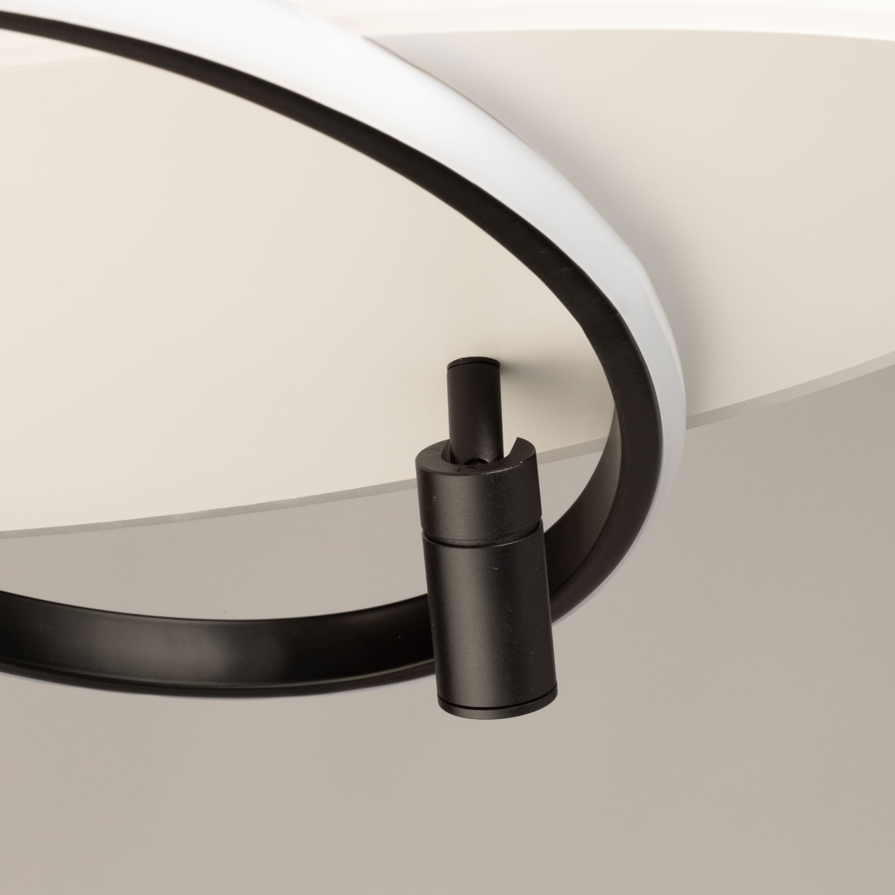 Металлическое основание потолочной люстры окрашено в белый цвет. Корпус плафона выполнен из сплава алюминия с цинком и окрашен в черный цвет. Светодиодный источник света закрыт матовым акрилом.