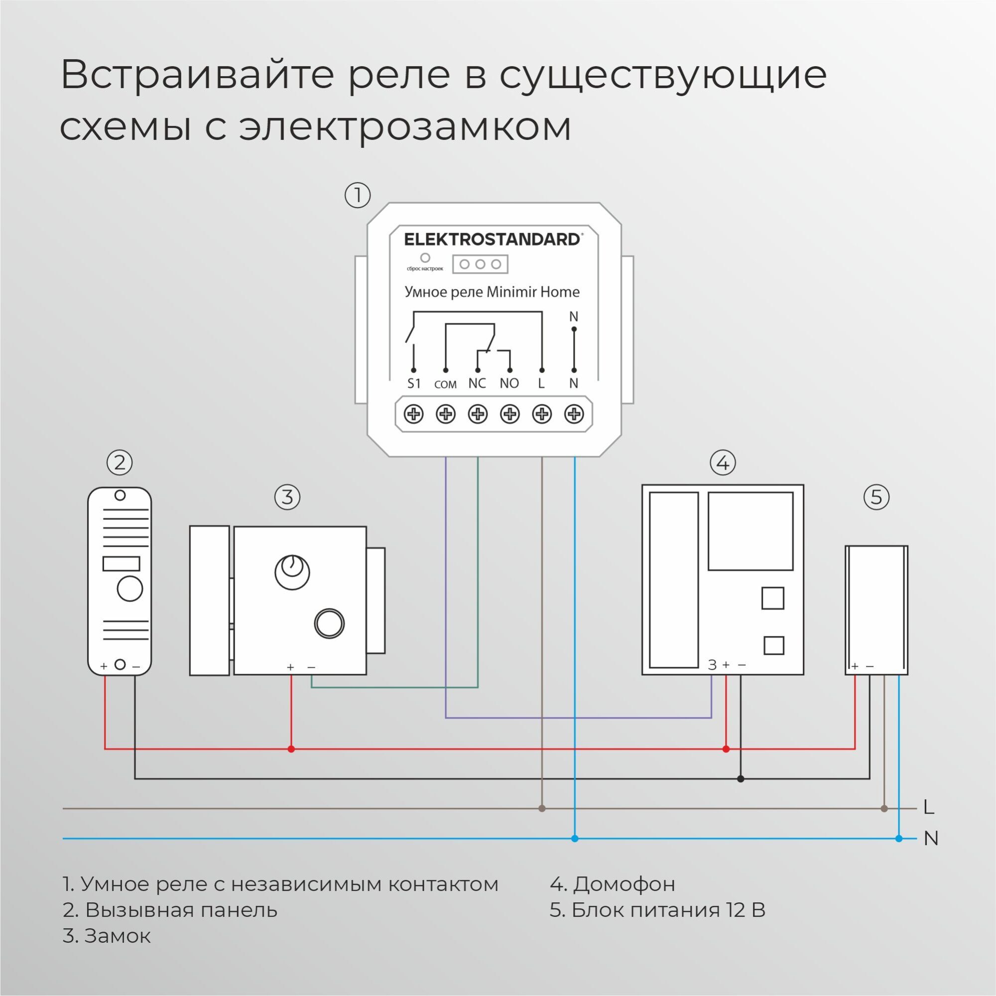 Реле Умный дом с независимым контактом Elektrostandard предназначено для дистанционного управления освещением и электроприборами. Независимый контакт позволяет коммутировать любой вид нагрузки, что дает возможность подключать его как к устройствам с напряжением 220 В, так и к низковольтным механизмам, например, к электрозамкам. Может использоваться для управления уличным освещением, электрическими котлами отопления, откатными воротами, насосами для септиков, шлагбаумами, электрозамками и перекрестными схемами управления.