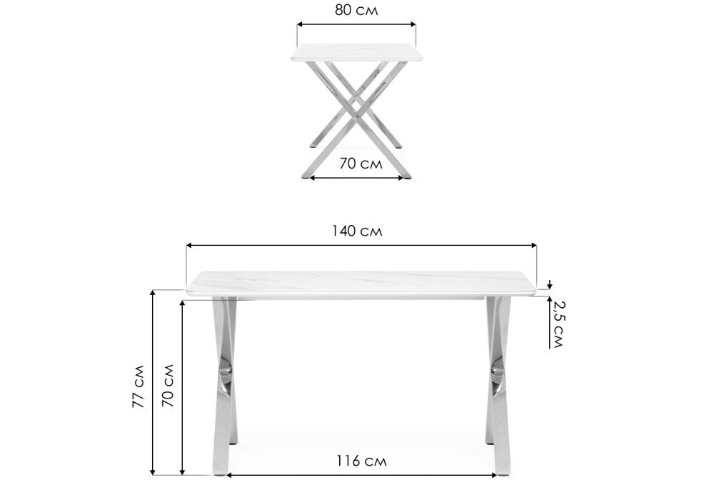 Толщина столешницы: 2,5 см. Материал каркаса - Металл; Материал ножек - Металл; Материал столешницы - Керамика; Цвет каркаса - Золотой; Цвет ножек - Золотой; Цвет столешницы - Белый; Ширина - 80; Высота - 77; Длина - 140;