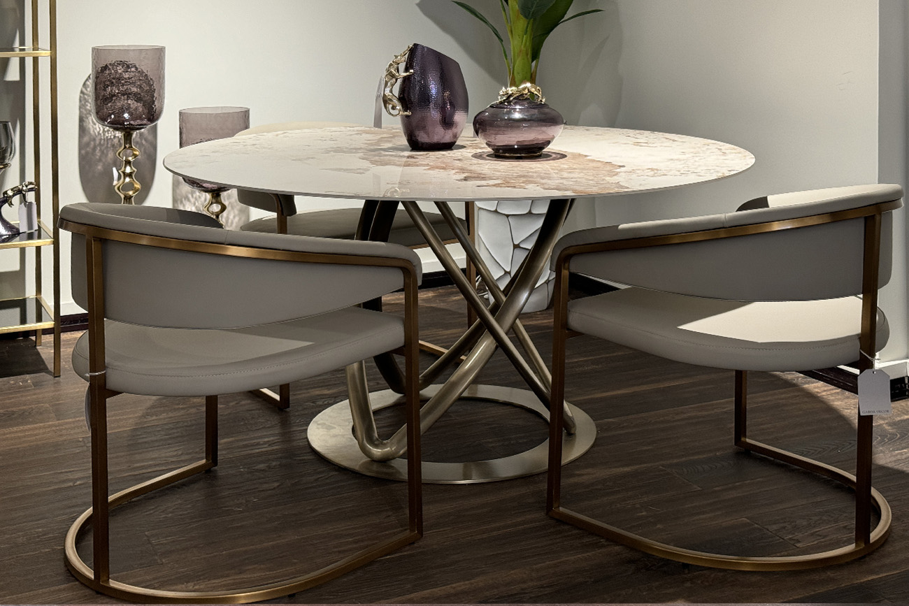 Круглый стол всегда пользуется популярностью: это самая бесконфликтная форма для общения с точки зрения психологов. Поэтому дружеские встречи, семейные ужины, переговоры будут проходить в позитивном ключе. Столешница из глянцевого керамогранита с узором натурального мрамора достаточно износостойка и не боится горячей посуды. Металлическое основание из переплетенных изогнутых труб придает этому столу воздушность и транспарентность.