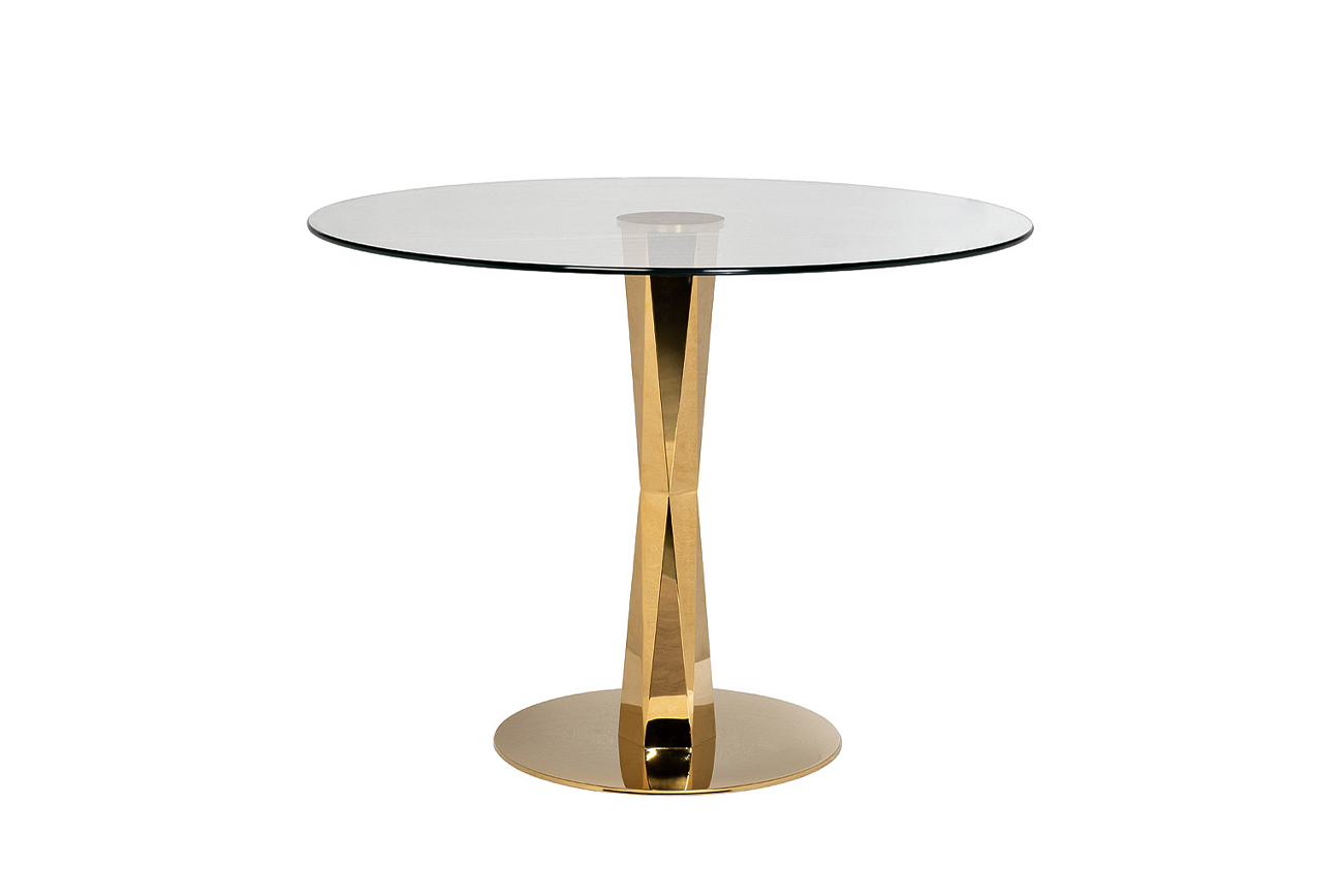 Красивый обеденный стол из стекла эффектно дополнит интерьер кухни или столовой. Круглая прозрачная столешница из закаленного стекла установлена на изящную основу из позолоченной стали. Несмотря на визуальную легкость круглый стеклянный стол устойчивый и ...