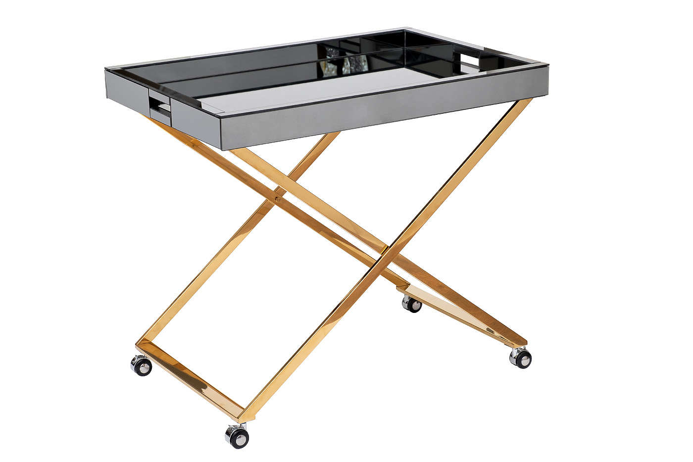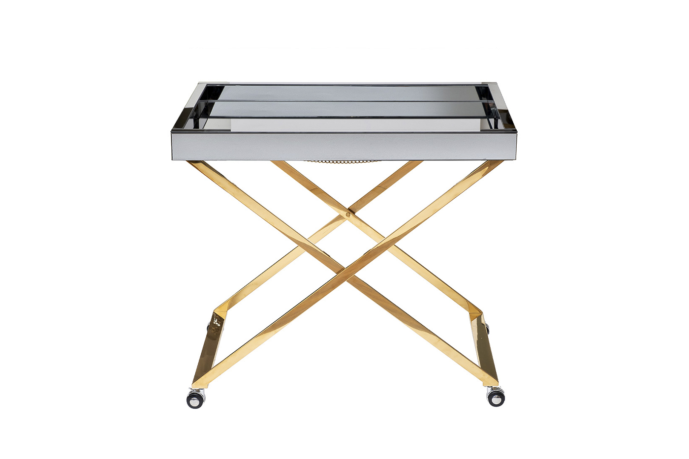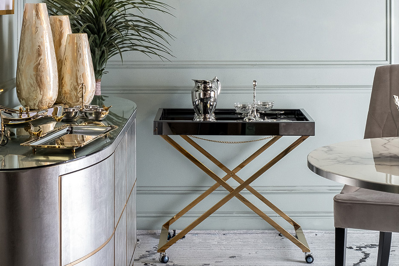 Дизайнерский сервировочный стол на колесах сделает каждое чаепитие, завтрак или ужин по настоящему аристократичной трапезой. Легкий и мобильный благодаря небольшим колесикам, он бесшумно перемещается по дому и облегчает процесс сервировки. Стильный зеркальный стол с металлическим каркасом довольно прочный и устойчивый, несмотря на визуальную легкость и изящество конструкции. Смотрится роскошно за счет блестящего хрома и зеркальной столешнице.