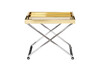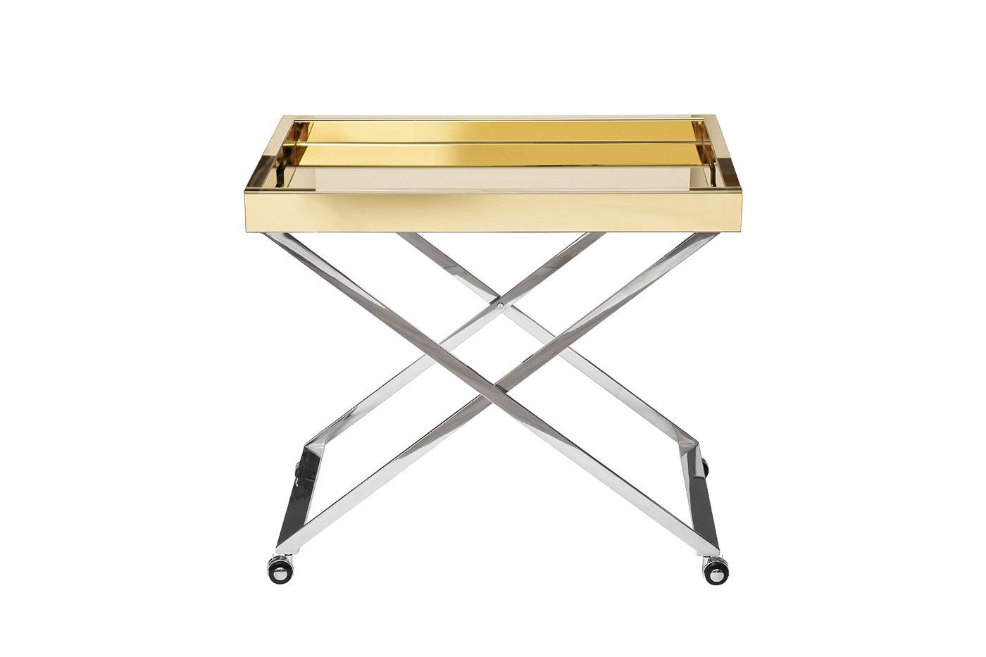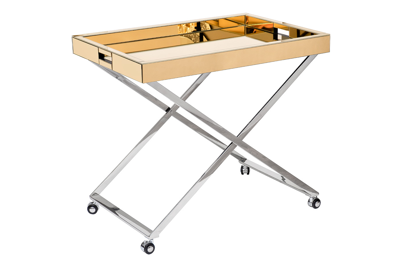 Роскошный сервировочный стол в современном стиле отлично справляется не только со своими прямыми функциями, но и может использоваться в качестве декоративного акцента в интерьере. Сочетание блестящей хромированной стали с зеркальными поверхностями делает этот оригинальной столик на колесах изящным украшением гостиной, столовой, спальни. Он визуально легкий и элегантный, мобильный за счет конструкции и небольших колесиков. Металлический каркас с золотым покрытием особенно выигрышно смотрится в интерьерных стилях ар-деко, авангард, шебби-шик, классика, модерн.