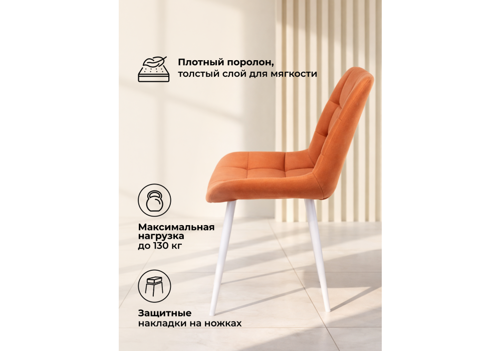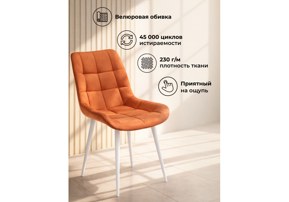 Материал каркаса - металл; Материал сиденья - велюр; Материал обивки - велюр; Цвет ножек - белый; Ширина - 50; Глубина - 60; Высота - 80; Ширина сиденья - 44; Глубина сиденья - 41; Высота сиденья - 48;