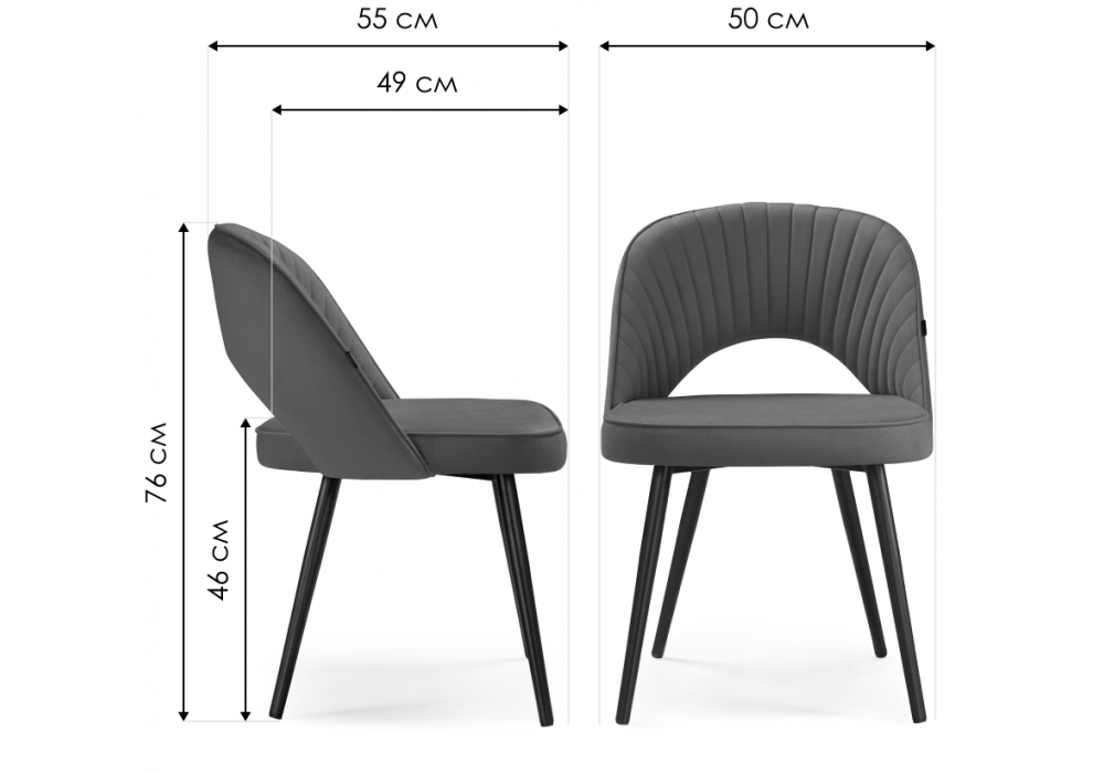 Материал каркаса - металл; Материал сиденья - велюр; Материал обивки - велюр; Цвет ножек - черный; Ширина - 50; Глубина - 55; Высота - 76; Ширина сиденья - 50; Глубина сиденья - 49; Высота сиденья - 46;