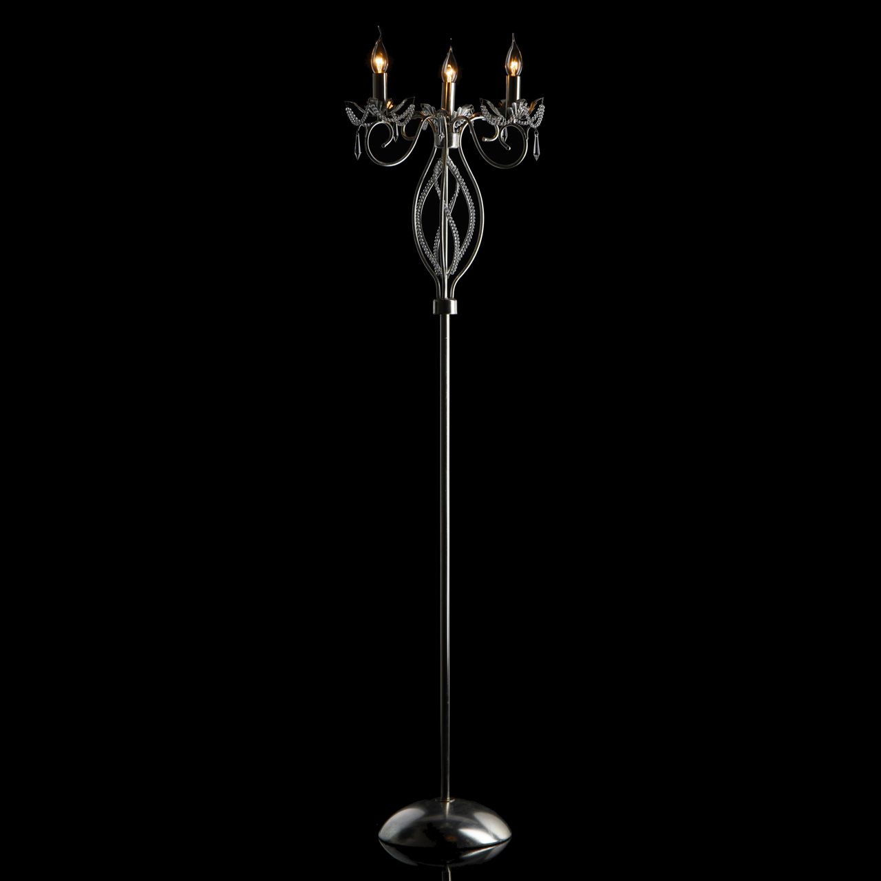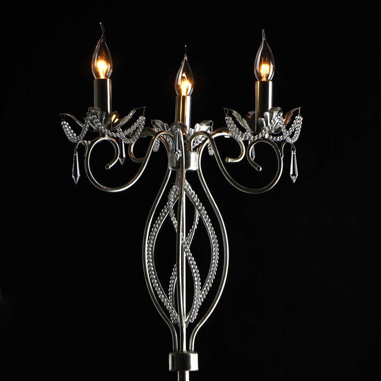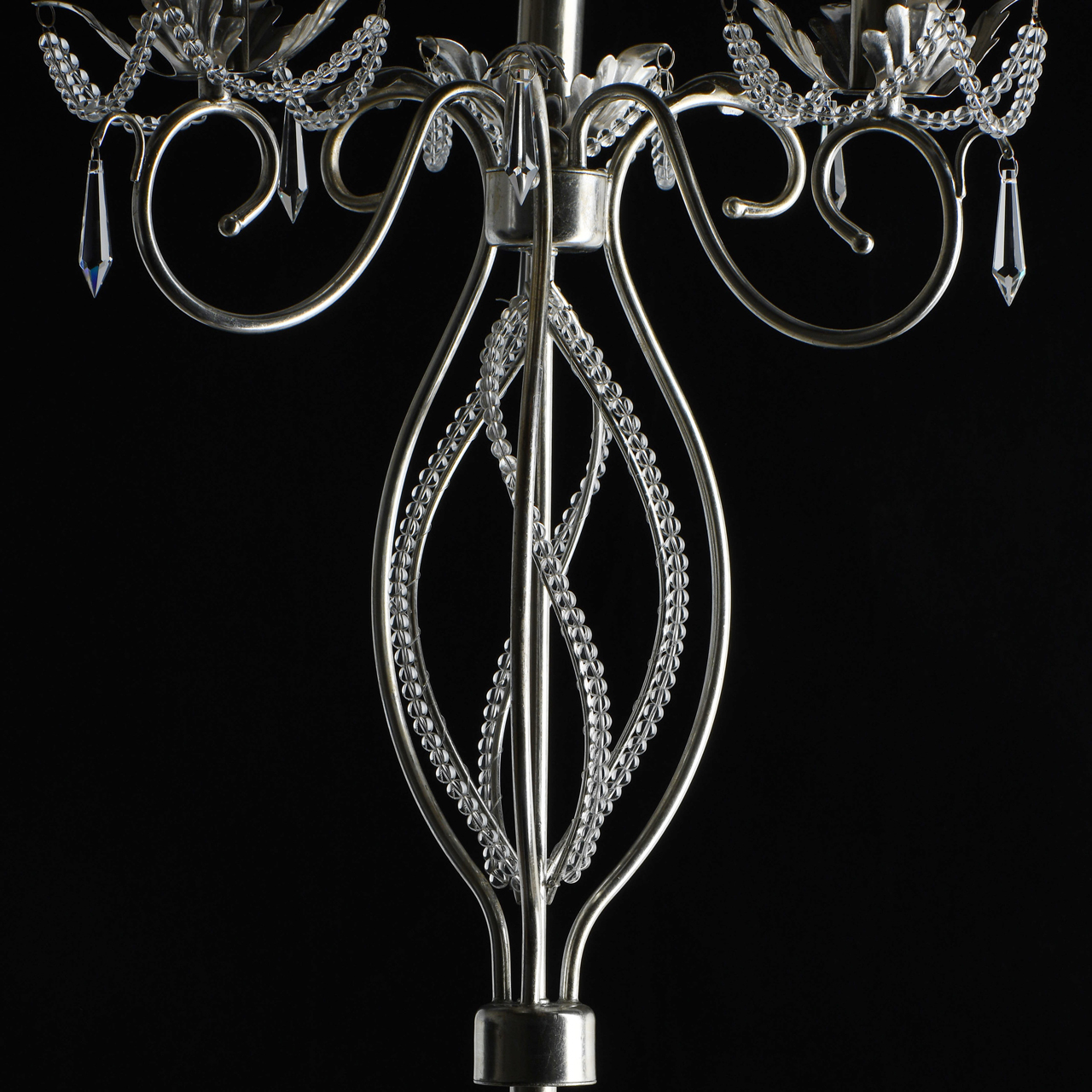Основание светильника выполнено из металла и покрыто сусальным серебром. Светильник декорирован бусами из прозрачного хрусталя и хрустальными подвесками формы капля.