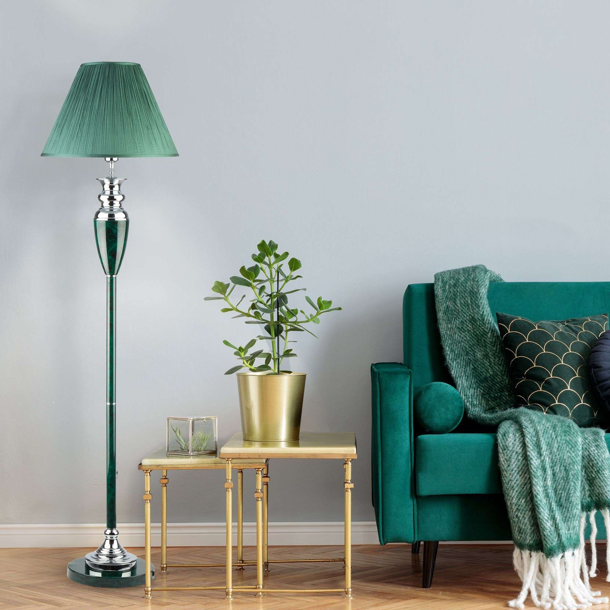 Благодаря зеленому тканевому абажуру напольный светильник создает мягкое равномерное свечение, подходящее для комфортного чтения книг в вечернее время. Прочный металлический корпус светильника устойчив к механическим воздействиям, а защитное покрытие обеспечивает надежную электроизоляцию и презентабельный внешний вид.