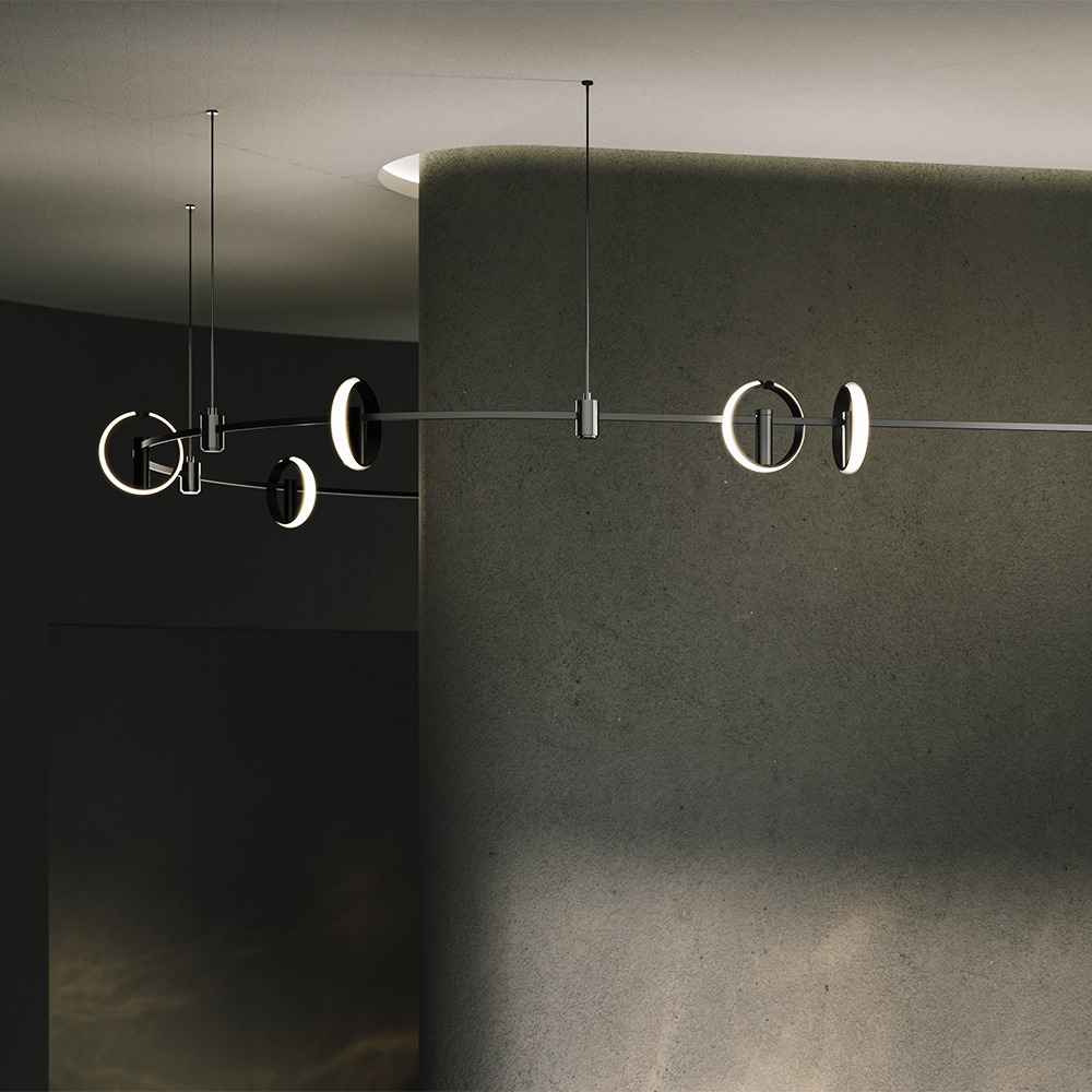 Трековый светильник серии ZERO. Дизайн: Alexey Danilin. Корпус: алюминий (черный/латунь). LED: Lumileds 10W, 550 Lm, 3000K, CRI>90. Угол рассеивания: 180°. Магнитное крепление. Поворот: >100°. Установка: сверху/снизу шины. Диммирование: DALI/0-10V. Размеры: Ø190×190 мм. IP20.