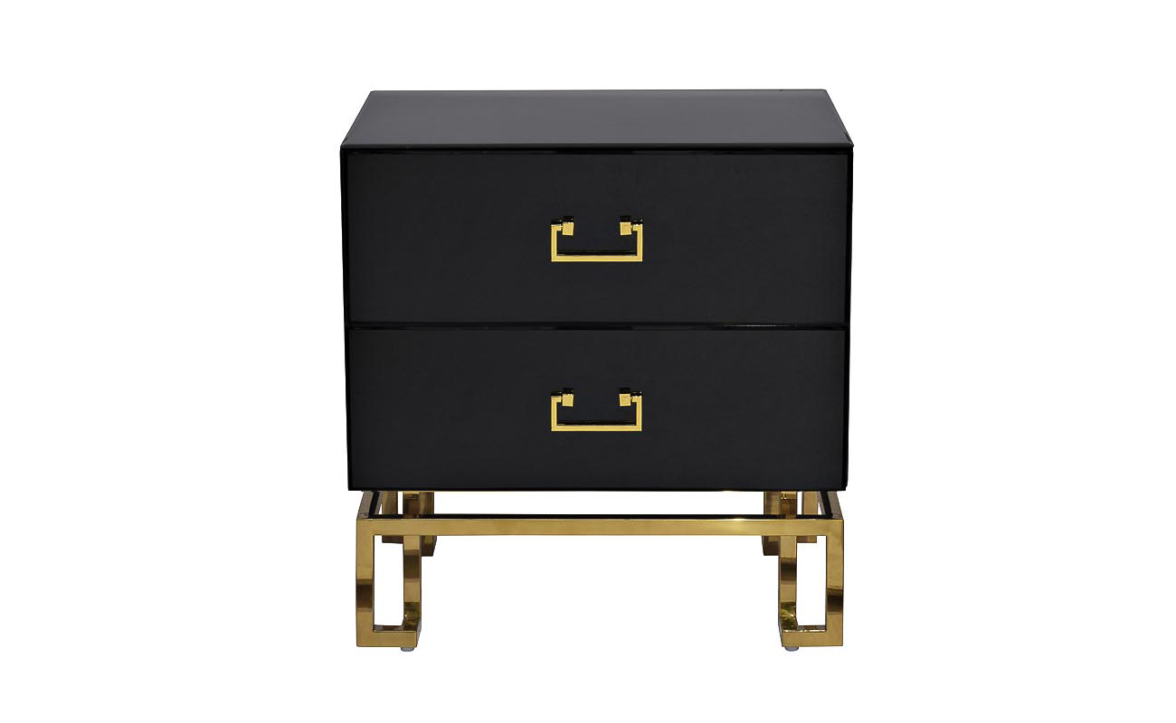 Представленная черная тумбочка станет гармоничным дополнением помещения в классическом стиле или стиле ар-деко, нео-классика. Черная тумбочка с ящиками идет на золотых металлических ножках оригинальной формы, из аналогичного ножкам материала выполнена фурнитура – ручки на 2х ящиках. Особую прелесть модели придают панели из черного стекла, из-за чего она выглядит очень роскошно. Дизайнерскую прикроватную тумбочку можно устанавливать у кровати в спальне, возле массивного стола в рабочем кабинете, у дивана в гостиной. Тумба прекрасно сочетается с комодом арт. KFG057, консолью арт. KFG058 и зеркалами арт. KFG047, арт. KFE1270