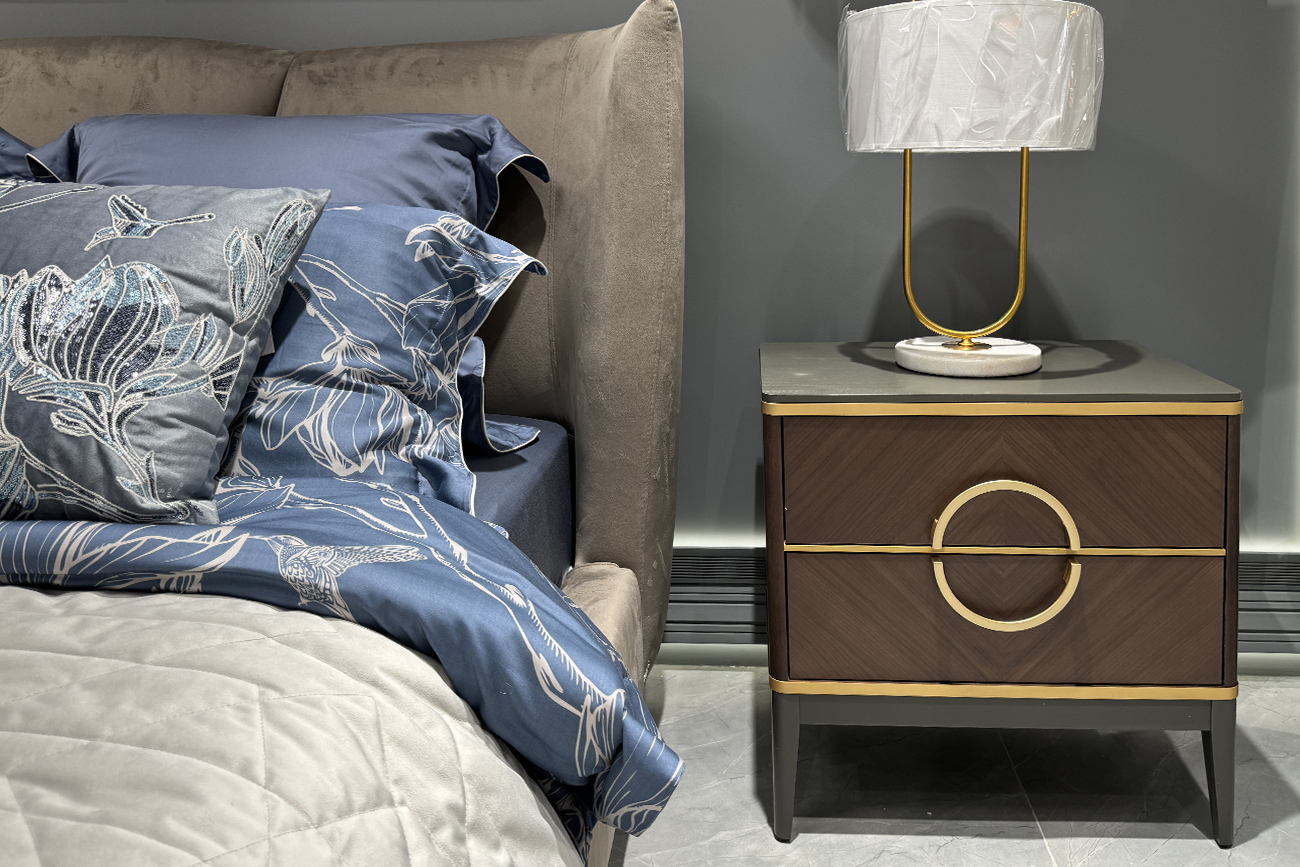 Прикроватная тумбочка в отделке тёмным шпоном привносит в интерьер спальни ощущение выверенной элегантности и статусной сдержанности. Геометрия фасадов с выразительным рисунком древесины подчеркнута тонким кантом, а фирменная кольцевая ручка добавляет образу характер modern luxury. Лёгкие опоры приподнимают корпус, создавая визуальную лёгкость при сохранении ощущения надёжности. Практичная прикроватная тумбочка с двумя выдвижными ящиками позволяет аккуратно разместить всё необходимое рядом с кроватью. Тумба прикроватная с 2-я ящиками из коллекции "ШПОН". Коллекция "ШПОН" является авторской разработкой студии Garda Studio, в стиле ар-деко.Габариты тумбы:ширина-60см, глубина-60см, высота-40см. Фасады коллекции "ШПОН" облицованы шпоном под цвет "Американский орех", украшены объемными полукруглыми ручками цвета "матовое золото"(ручки-металл) и декоративными элементами из массива бука под цвет "матовое золото". В состав коллекции так же входит: тумба под TV-арт.151SV-10003; консоль-арт.151S...