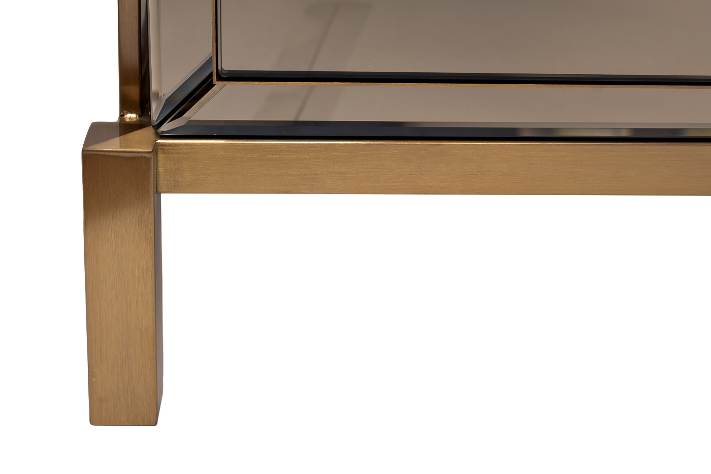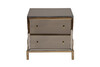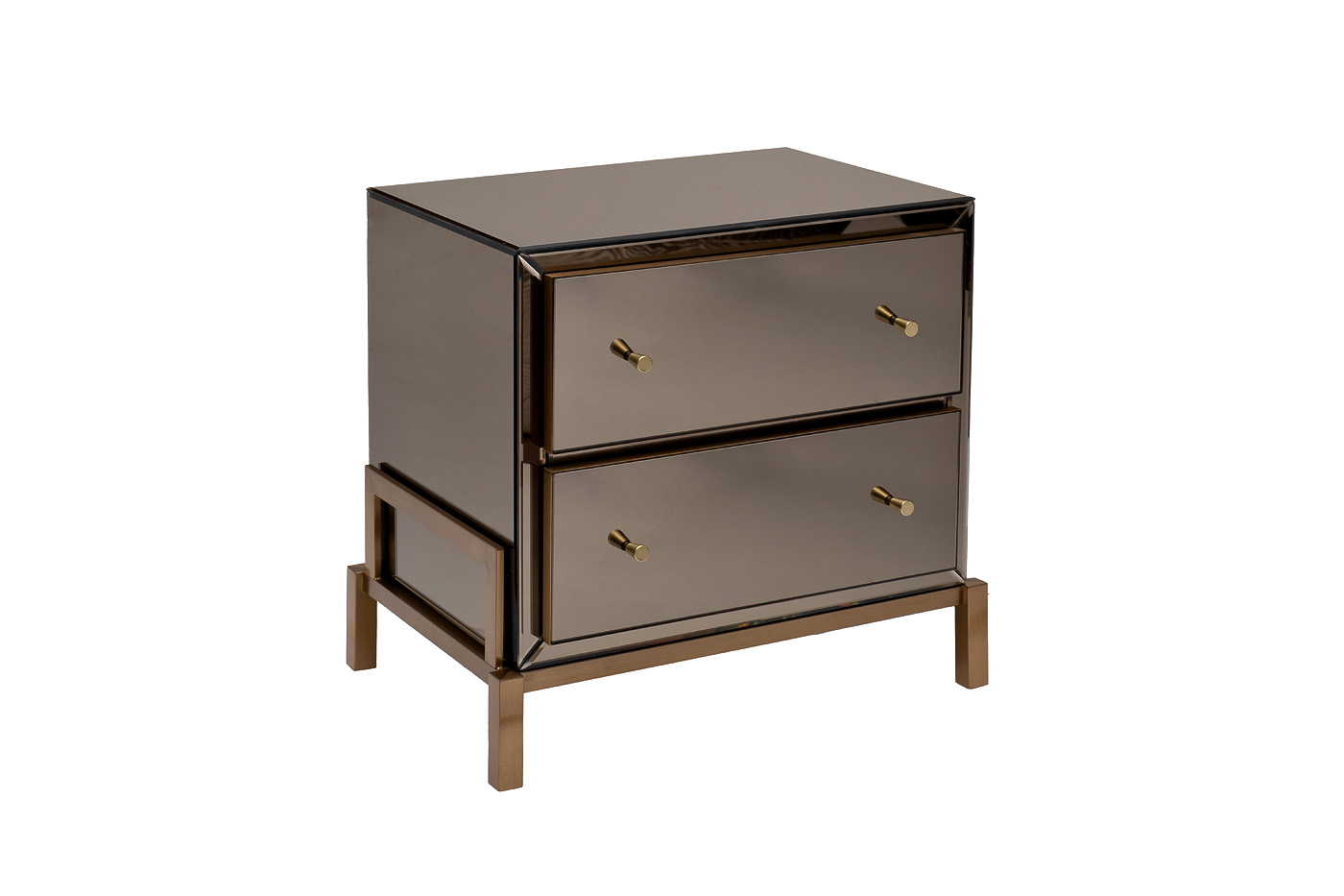 Прикроватная тумбочка под золото добавит нотку аристократизма и изысканной элегантности в обстановку спальни, будуара или гостиной. Особенность данной модели – отделка из зеркала и нержавеющей стали. Дизайнерская тумбочка с двумя ящиками составит стильную компанию кровати, прекрасно впишется в интерьерную стилистику ар-деко, неоклассика, фьюжн. Материалы: зеркало матовое, МДФ, нерж. сталь золото матовое