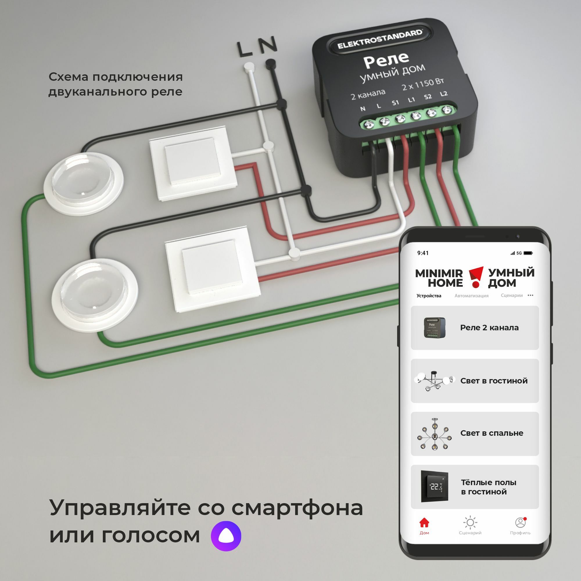 Умное реле является частью системы Умный дом Minimir Home и предназначено для дистанционного управления освещением. Контроль состояния и управление реле осуществляется с помощью любого смартфона или планшета, подключенного к сети интернет. Приложение Minimir Home позволяет программировать сценарии работы светильников, а также управлять ими с помощью голосового помощника Яндекс Алиса.