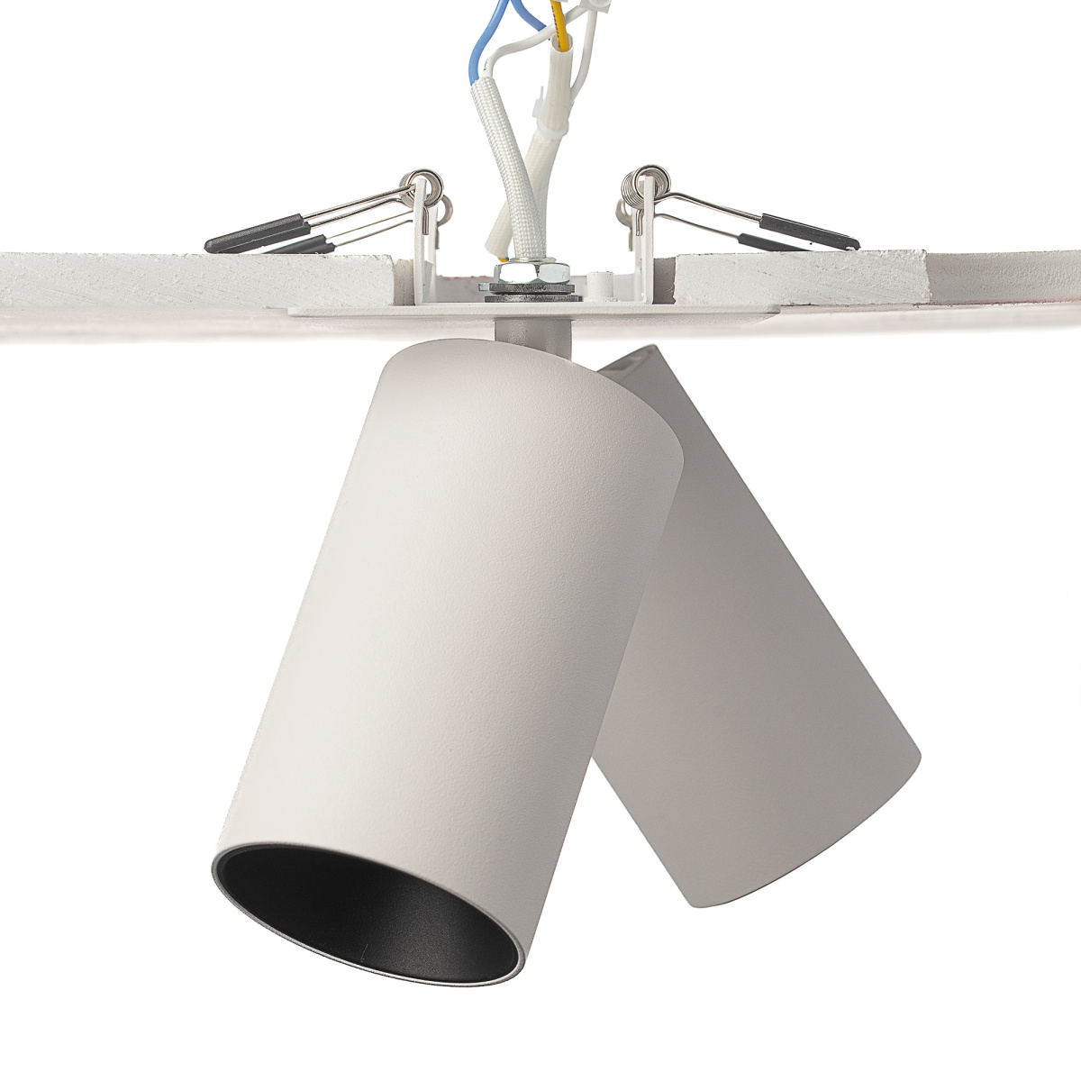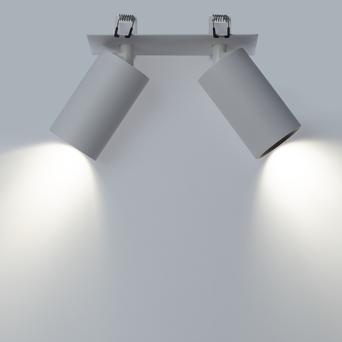 Корпус модели металлический, стильного белого оттенка. Плафоны цилиндрической формы имеют поворотное крепление, позволяющее менять направление светового луча. Источником света служат две светодиодные лампочки с цоколем GU10 мощностью не более 10Вт, встраиваемый тип крепления. Плафоны вращаются независимо друг от друга, что дает возможность формировать разный рисунок света.