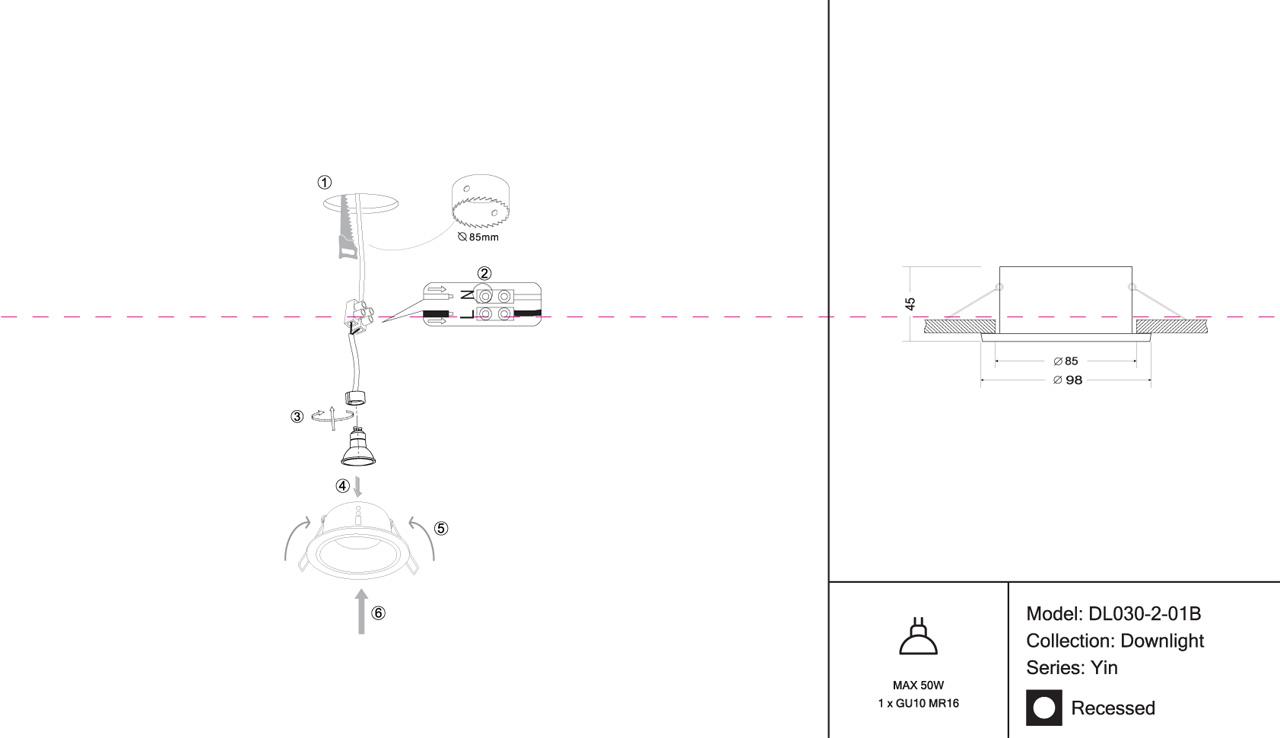 - Диаметр врезного отверстия: 85 мм (8.5 см)